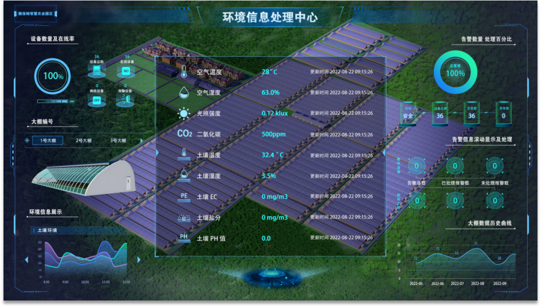 通過(guò)天地圖、虛擬園區(qū)、智能大棚等園區(qū)管理控制板塊,可以直觀(guān)立體的展示園區(qū)分布、大棚數(shù)量、種植面積以及物聯(lián)網(wǎng)設(shè)備在線(xiàn)等情況,并可以具體查看某個(gè)大棚的編號(hào)、建棚日期等基本信息以及棚內(nèi)農(nóng)作物的實(shí)時(shí)生長(zhǎng)情況。